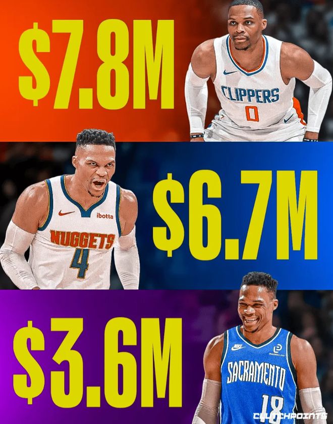 大家可以看看威少离开湖人后他的薪水下滑有多么严重!22-23赛季他被湖人交易到爵士后遭到裁员,随后威少以一年78万的合同加盟快船,在快船打了半个赛季后2023年夏与快船签下两年780万。