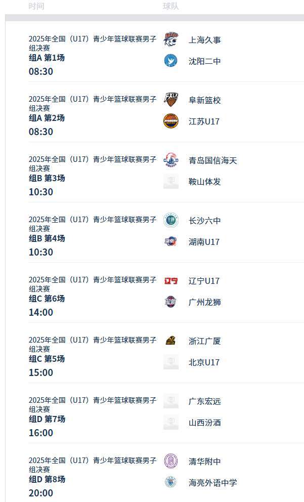 第一比赛日共有8场比赛要打,除了上述5场之外,像浙江广厦对阵北京U17,清华附中对阵海亮外语中学,长沙六中对阵湖南U17,同样值得喜欢篮球的球迷朋友关注。