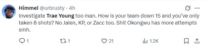 4.联盟好好调查一下特雷杨吧,球队落后15分他却不愿意出手,没有杰伦-约翰逊、波尔津吉斯、里萨谢的比赛他本该承担更多,但他竟然比奥孔古的出手还要哨,这太糟糕了。