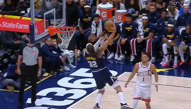 当时,穆雷提上来帮戈登做了一个无球掩护,随后戈登空切进入内线,直接起飞,约基奇在上线持球,适时送出精妙的传球,助攻戈登完成扣篮。戈登在空中接球,甚至还做了一个360度的转身,无论是起跳时机、飞行高度、舒展程度还是扣篮力度,都是完美的。