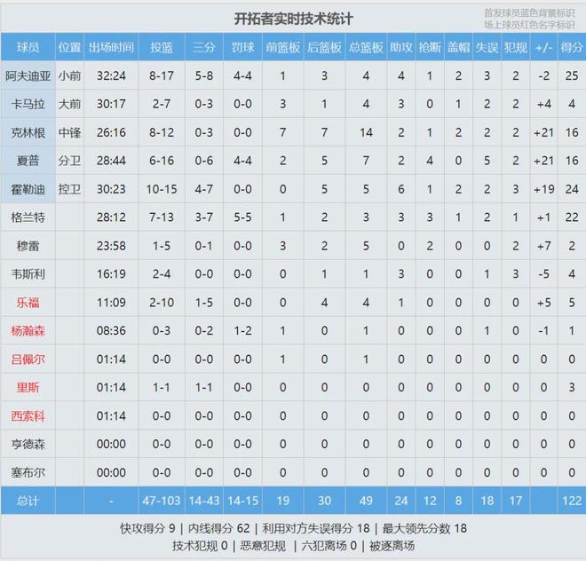 湖人首发:里夫斯、拉拉维亚、范德比尔特、八村塁、艾顿;开拓者首发:霍勒迪、夏普、阿夫迪亚、卡马拉、克林根。罗威今天被下放到发展联盟训练,距离复出不远了。第一节还剩6分55秒,杨瀚森替补登场,三分线外2中0。