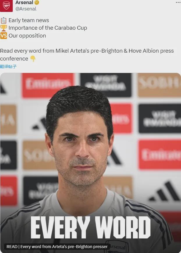 不过阿尔特塔也说了,要保持“竞争力”,这点也没错。对手毕竟是布莱顿,而且阿森纳其实不能这么早就被淘汰,这不是你在不在意联赛杯冠军的问题,这么早就少一个赛事,后期很多球员就会少很多出场机会,像凯帕这种就指望杯赛呢,踢一场就没了,后面就少很多表现机会了。