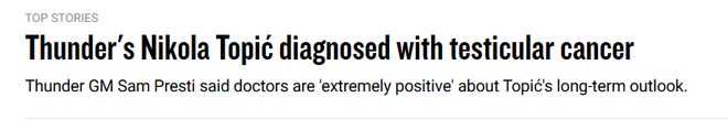 北京时间10月31日,此前,球迷们只知道雷霆后卫托皮奇接受了一项与睾丸相关的手术,但并不清楚具体情况。雷霆总经理普雷斯蒂今日官宣了托皮奇的癌症诊断结果,真相才得以公布。