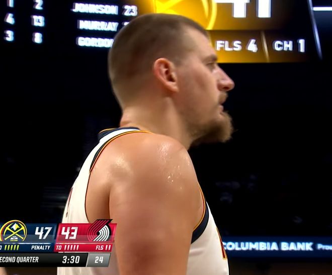 当时双方打成98:99开拓者最后三分钟反超1分,此时约老师在篮下撞开开拓者俩人完成一次2+1,开拓者打他竟然敢玩小阵容,那是真的不太行。约基奇这个进攻,首先在进球之后帮助球队拿回了主动权,他也加罚命中,掘金101:99领先2分。