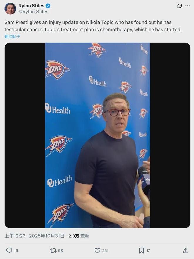 但在今天,雷霆终于透露,托皮奇出现睾丸癌,不得不接受化疗。