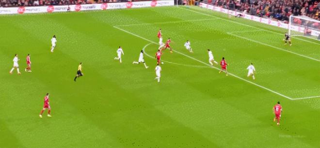 第二分,是赫拉芬贝赫经典的大力炮轰。问题类似在这个视角可看到,利物浦的前锋引导对方中卫跑开了,两个边锋拉边及中场的后插上,这不就是夺冠赛季主要套路。
