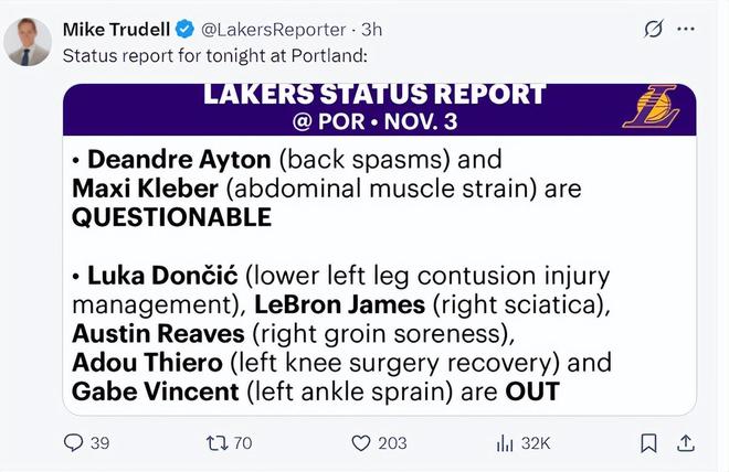 这场比赛除了詹姆斯、蒂耶罗、文森特无法登场外,里夫斯、东契奇也无法在背靠背第二场出战。