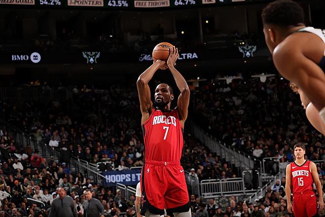 本场比赛中,火箭的锋线球星凯文-杜兰特(Kevin Durant)总算是展现出了自己应有的水准。杜兰特全场出场37分21秒,投篮15中11,三分线外2中2,罚球9中7,得到了全队最高分31分外加3篮板7助攻的数据,还有3次失误和2次犯规,正负值为+2。杜兰特在进攻端保持了自己超高的手感,他的得分能力、单打能力和投射能力都有了充分地体现,他也是抓住了不算太多的出手机会得到了大量的分数。杜兰特在传球和组织方面也能够起到很好的效果,他也是能够在遇到包夹时把球传出来,而且他也是控制了自己的失误数。杜兰特在防守端的表现也算是中规中矩,也没有出现什么太大的问题,而且他在比赛关键时刻也是对扬尼斯-阿德托昆博(Giannis Antetokounmpo)进行了有效地限制。总体来看,杜兰特在本场比赛中的表现算得上是攻守兼备,他也是为球队的这场胜利做出了不小的贡献。