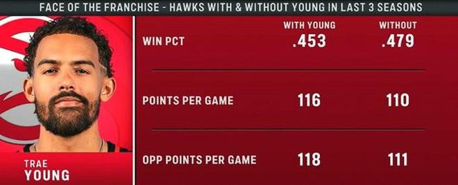 在比赛期间,转播方晒出了一组关于老鹰队当家球星特雷-杨的数据:在过去三个赛季,老鹰队在特雷-杨出战的比赛中胜率为45.3%,而在特雷-杨休战时胜率则为47.9%。在得失分数据上,特雷-杨出战时球队得分数会从110分提升到116分,但失分数也会相应从111分提升到118分,相比之下,净得失分为-1。