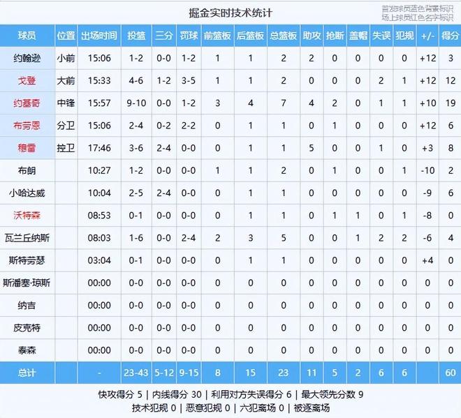 掘金数据:约基奇19分7板4助2断、戈登12分2板、穆雷8分1板5助、布劳恩6分1板、小哈达威6分1板、瓦兰丘纳斯4分5板、约翰逊3分2板2助、布朗2分2板、沃特森1板、斯特劳瑟1板