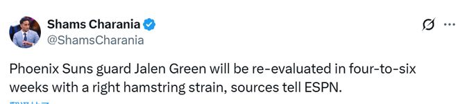 Shams的报道和之前太阳队内部记者甘巴多罗预测的时间表一致。即便格林能在4周后回归,他仍将缺席球队接下来的13场比赛。