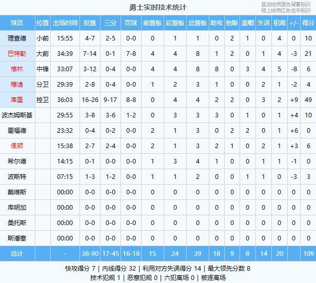 勇士数据:库里49分4板2助2断、巴特勒21分8板1助2断、波杰姆斯基10分3板3助、理查德10分1板2断、格林6分8板8助3帽、佩顿6分3板2助、穆迪4分3板1助、波斯特3分2板、希尔德4板1助、霍福德3板2断2帽