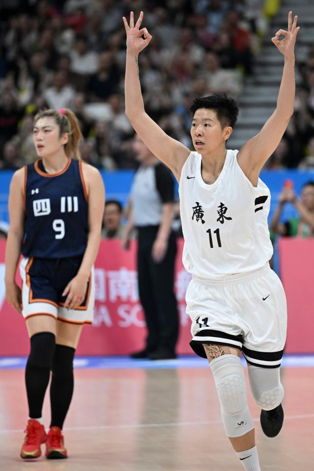 这当然是篮球技战术的胜利。广东女篮从淘汰赛开始就明显增加三分出手比重,显然是有意在针对内线高大的四川队进行演练。决赛一战,她们34%的三分命中率不算突出,但依然比四川多进3记,其中杨舒予一人三分10投4中,末节的两次远投有着一锤定音的意味。而在更多出手三分的情况下,广东也将四川队的防守调离篮下,并借此打出了更多攻筐的回合,同时拼出了更多进攻篮板。防守端,广东不断绕前防止韩旭接球,在她拿球后也总有人协防干扰,最终令韩旭13投只有4中。