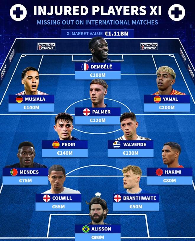 因伤缺席本月国际比赛日最贵11人阵容:亚马尔、登贝莱领衔