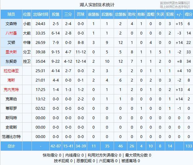 东契奇34分12板7助、里夫斯33分5板8助、艾顿22分12板1助4帽、八村塁14分2板、拉拉维亚10分5板2助、海斯8分6板2助2帽、文森特6分2板4助、克内克特4分1板2助、克莱伯2分1板
