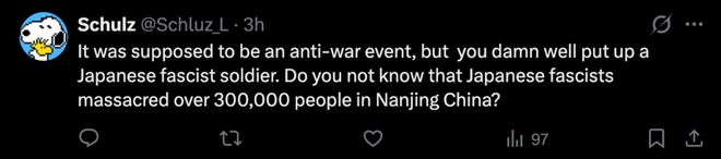 “这个比赛本该反对战争,但你们却放出一张日本法西斯军官的照片。你们难道不知道日本法西斯在中国南京屠杀了至少30万平民吗?”