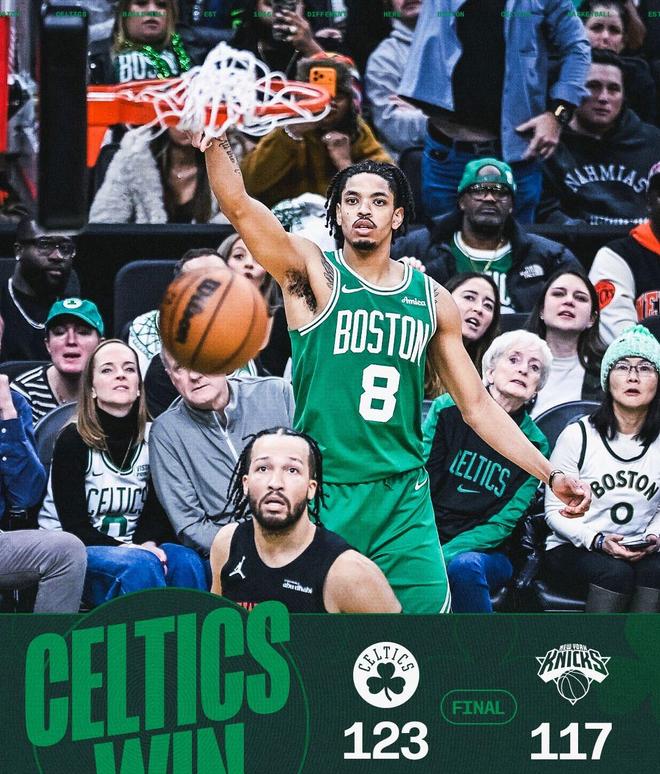 然而,布朗率队连续冲击篮下得分,绿军就此收割比赛。最终,凯尔特人以123比117险胜过关,还上演了14分逆转好戏,而尼克斯的4连胜就此被终结。纽约从东部第2跌至第4,绿军则迎来了2连胜。