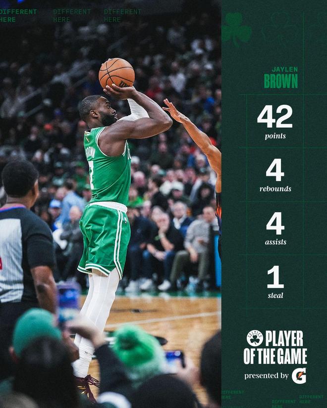下半场,布朗再得20分。布朗在第3节轰下了15分,率队单节以36比24领先,帮助绿军反超18分,就此奠定取胜的基础。送出了全队第二多助攻的布朗,在防守端的表现也是一如既往的强悍。布朗的暴走,是凯尔特人逆转取胜的主因。数据显示,这是布朗本赛季21场比赛里的第三次单场40+,过去两个赛季布朗一共3次40+,一共打了133场比赛。