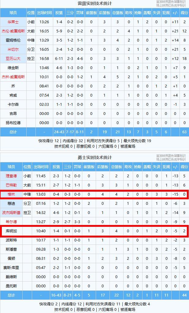 亚历山大18分3板1助、杰伦·威廉姆斯12分2板4助、维金斯9分2板、霍姆格伦8分4板2助、肯威5分1板1助、米切尔5分2助、卡尔森3分、华莱士2分3板2帽、杰林·威廉姆斯1分5板2助、乔1板1助
