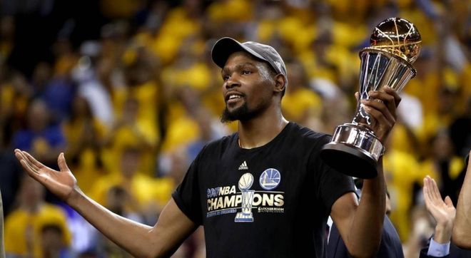 来到勇士之后,杜兰特三度闯入决赛,并拿到两个冠军和两个FMVP