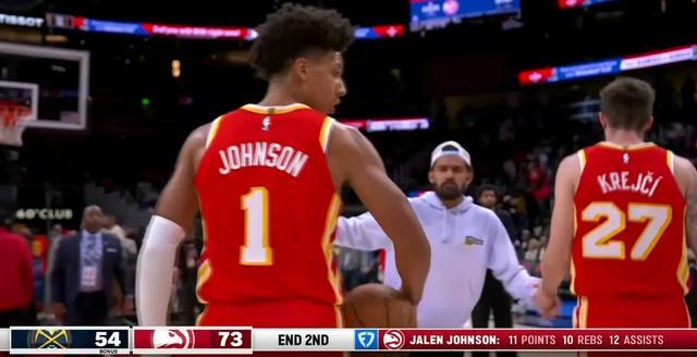 掘金23分逆转老鹰的这场比赛,杰伦-约翰逊半场11分10篮板12助攻,只用了一节多一点的时间就拿到了三双。在他的不断串联之下,老鹰全队半场就六人得分上双,这数据也算相当罕见了。