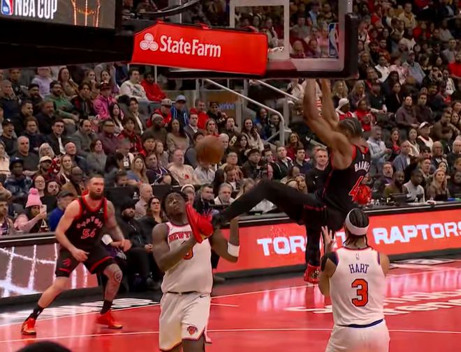 次节回来,阿努诺比篮下单臂拦截马穆凯拉什维利上篮,阿努诺比篮下劈头盖脸大帽掀翻迪克,连续送出火锅过于凶残。唐斯且退且防,暴起大帽扇飞巴恩斯上篮,克拉克森径直杀向篮筐挑篮命中,尼克斯打出12-2小高潮,反超比分。克拉克森突破再造杀伤,猛龙无奈选择挑战,最终成功改判,唐斯底线强攻 转身闪开防守潇洒上篮命中,巴恩斯低位接球抹过哈特完成双手炸扣,立马回应。唐斯中路突击,直接起飞滑翔单臂暴力隔扣珀尔特尔,布伦森抛投再中,尼克斯领先到11分。英格拉姆借掩护送出击地妙传,珀尔特尔顺下接球轻松上篮得手,及时止血。布伦森无视防守抛投再中,尼克斯次节打出34-13攻击波,半场战罢已经将分差拉开至17分。