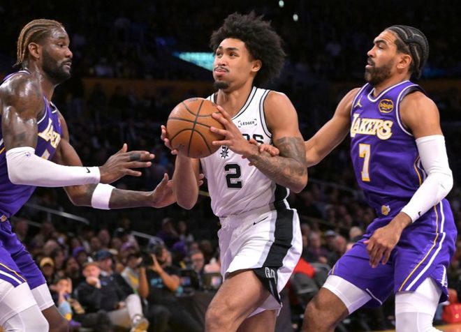 本场比赛詹姆斯、东契奇和里夫斯联手出击,上来詹姆斯率先跳投拿分,随后两队陷入拉锯战,东契奇突破打成2+1,詹姆斯反击打进取得13-7领先。卡斯尔连续冲击拿分咬住,八村三分命中,巴恩斯立马回敬,哈珀反击拿分,东契奇连续命中2记三分依然保持领先。凯尔登上来突破打进,随后篮下补篮,接着三分也进,直接反超比分。湖人进攻手感有所下滑,凯尔登三分再进,福克斯三分也进,马刺直接占据主动,最后凯尔登准压哨三分命中,首节马刺39-30反超比分。