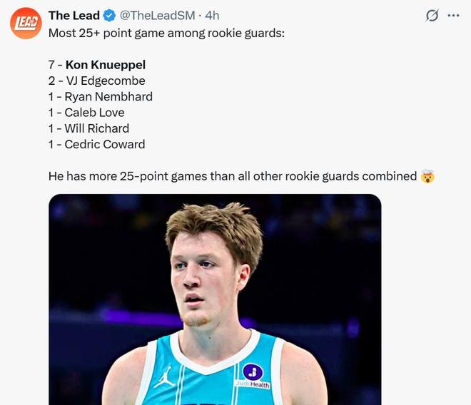 与同届新秀相比,克努佩尔更是占据着绝对的优势,本场已经是其本赛季第7次交出单场25+得分表现,不仅高居同届第一名,更是超过其余新秀25+场次总和。