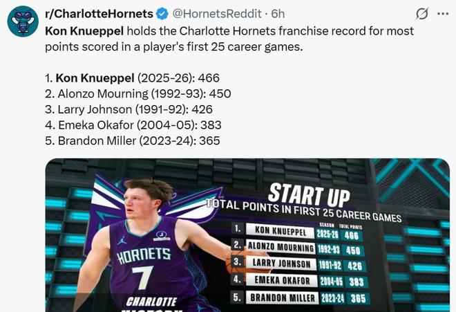 本场拿下29分后,克努佩尔在生涯前25场比赛中已经拿到466分,超越莫宁位列黄蜂新秀前25场得分总和队史第一。