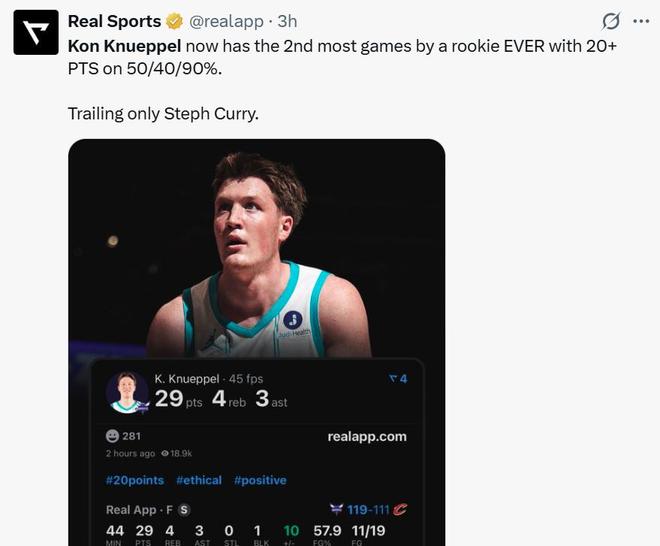 本场再次以“180俱乐部(50%/40%/90%)”效率砍下20+后,克努佩尔这一数据表现场次高居NBA历史新秀第二,仅次于库里。