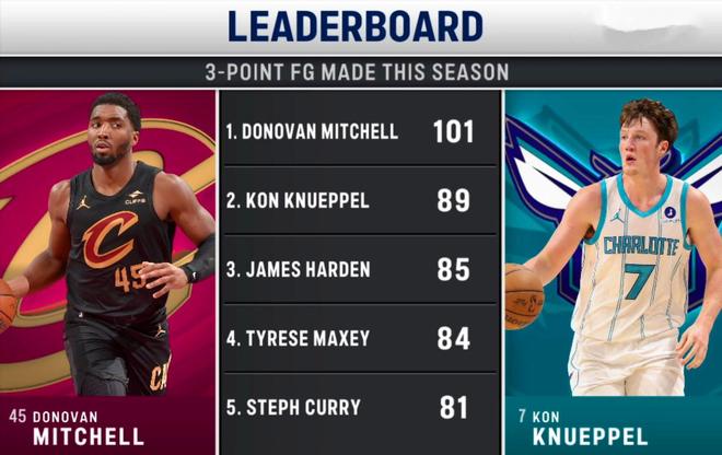 而本场命中3记三分之后,克努佩尔本赛季已经命中89记三分,高居联盟第二,仅次于米切尔的101记。