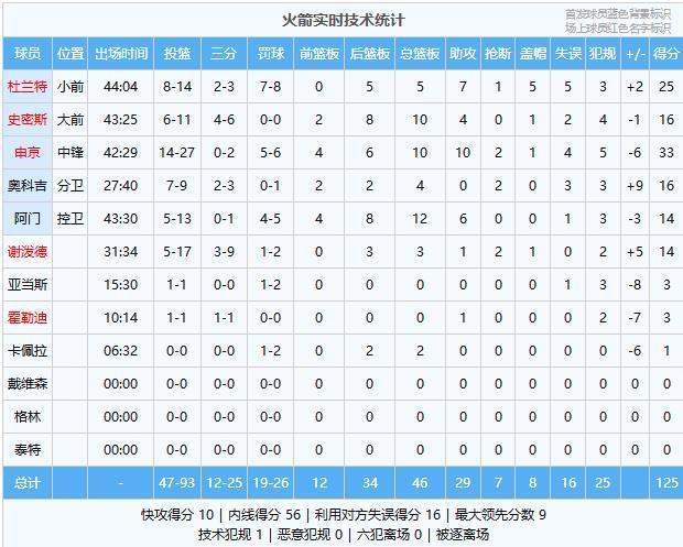 约基奇39分15板10助2断2帽、穆雷35分3板5助、约翰逊13分3板2助、小哈达威13分1板2助2断、斯潘塞·琼斯11分3板2断3帽、瓦兰丘纳斯8分3板1助、沃特森5分、布朗2分9板4助3断、纳吉2分1板