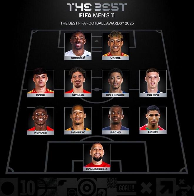 此外,2025FIFA年度最佳阵容也随之出炉,多纳鲁马(巴黎/曼城)、阿什拉夫(巴黎)、帕乔(巴黎)、范戴克(利物浦)、门德斯(巴黎)、帕尔默(切尔西)、贝林厄姆(皇马)、维蒂尼亚(巴黎)、佩德里(巴萨)、亚马尔(巴萨)、登贝莱(巴黎)入围。