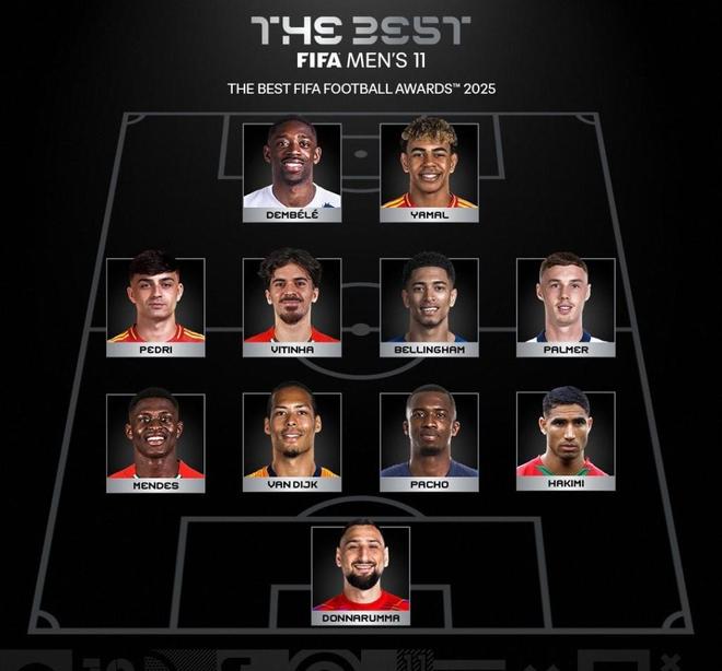 男足最佳阵容则是:多纳鲁马;阿什拉夫、帕乔、范戴克、门德斯;帕尔默、贝林厄姆、维蒂尼亚、佩德里;亚马尔、登贝莱。