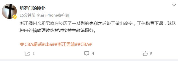 媒体人所罗门的臣仆报道:“浙江稠州金租男篮在经历一系列的失利之后,终于做出改变,丁伟指导下课,球队将由外籍助理教练暂时接替主教练职务。”