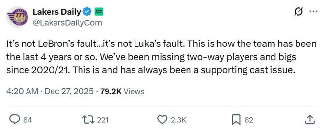 湖人媒体Lakers Daily则积极支招,认为他们应当引进一些攻防兼备的球员和大个子,球队问题根本不能怪詹姆斯与东契奇,一直都是角色球员的错。