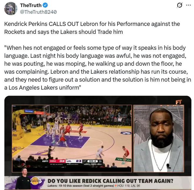 “他们的真正问题是阵容不具备高水平的防守能力,尤其是外线防守,这就让问题回到原点,雷迪克你本人是不是要承担责任?抱怨每一次吹罚,不努力回防的东契奇要不要承担责任?心不在焉只看数据单,肢体语言明显能够看出没有投入的詹姆斯要不要负责?”