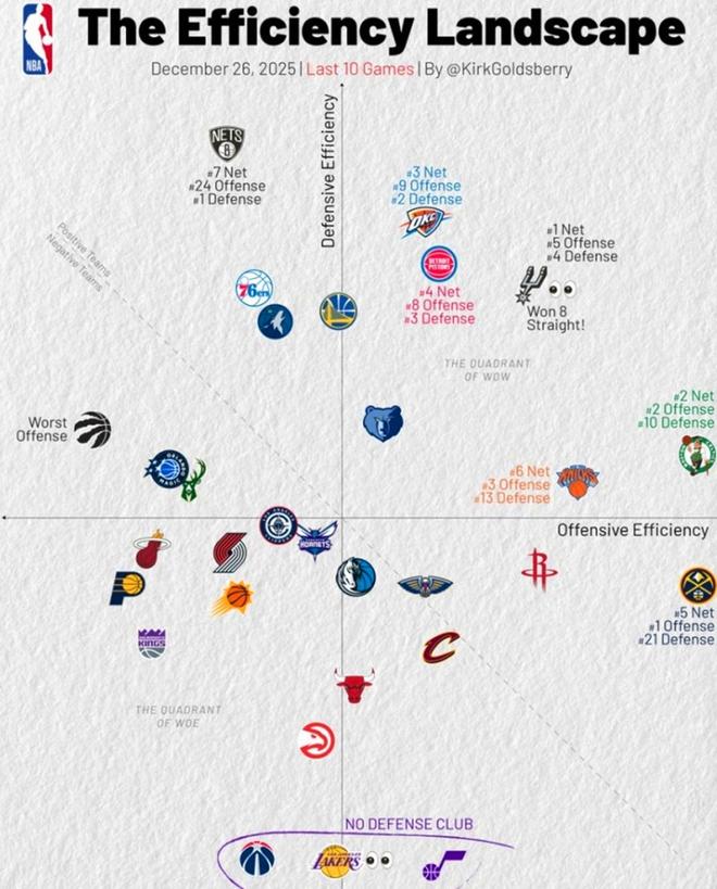 美媒Kirk Goldsberry统计过去10场表现更是直观展现这一点,湖人与爵士和奇才一样是“无防守球队”。