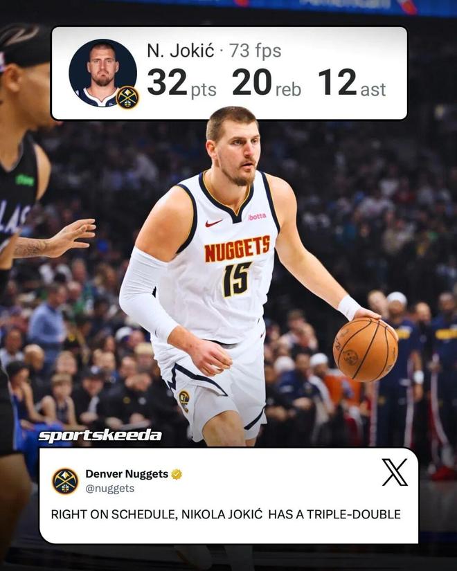 ——这是约基奇生涯第8次单场拿下30分20篮板10助攻,自1976年NBA和ABA合并以来,联盟其他人加起来一共只拿到过6次这样的三双