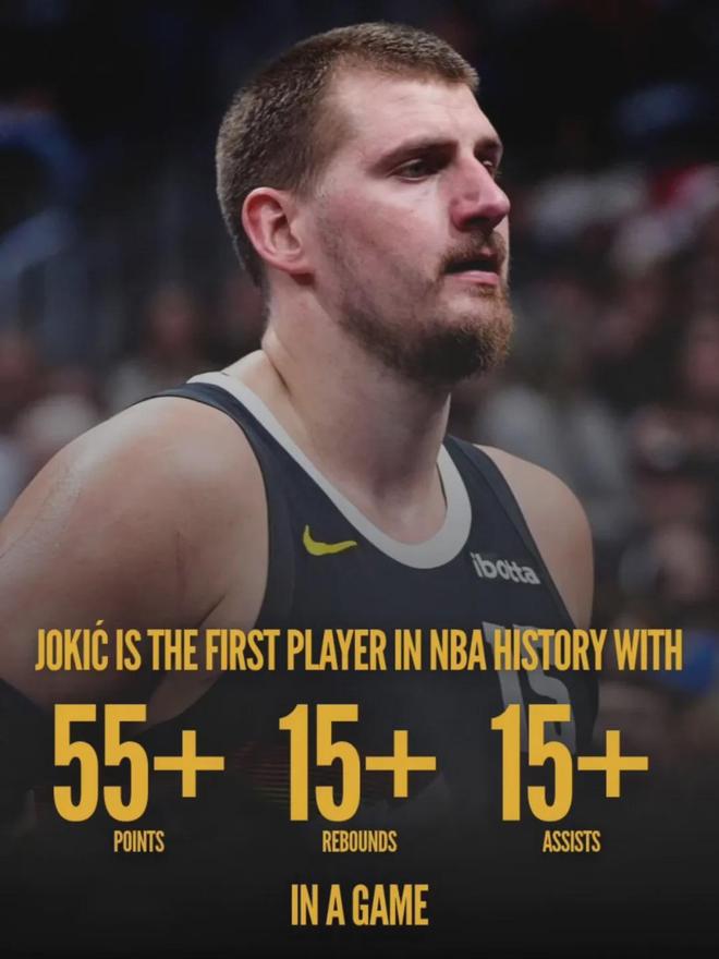 约基奇的个人表现有多出色应该不用多说了,上一场对阵森林狼,他刚刚打出了生涯最强比赛之一,全场21中15,三分6中4,罚球23中22,得到56分16篮板15助攻——这是NBA历史上第一次单场55+15+15,约基奇在加时赛拿了18分,同样是NBA历史纪录。