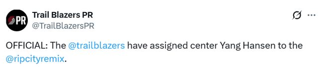 开拓者官宣下放杨瀚森!今日为混音出战蓝队G联赛场均贡献16+9+3
