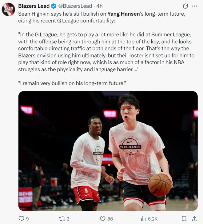 开拓者专家肖恩-海金这样评价杨瀚森:我依旧看好杨瀚森的长远未来,他近期在发展联盟表现的游刃有余,在G联赛他有球权可以更多像打夏季联赛那样打球,全队的进攻由他掌控,他在底线的组织非常出色,攻防两端指挥调度得心应手,这正是开拓者管理层预想未来杨瀚森的样子。只是目前开拓者的阵容、体系不适合让他扮演那样的角色,在NBA的困境很大程度上是因为身体对抗与语言障碍。